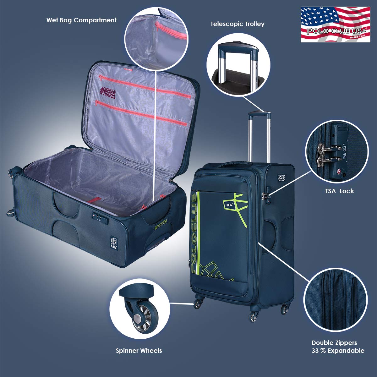 - Kết hợp các phụ kiện màu cùng với nội thất stylist và khóa kéo đôi bằng sáng chế với tính năng mở rộng thêm 25% làm cho chiếc vali này trở thành một món đồ. Tay cầm chắc chắn với bộ phận bảo vệ bên hông và bộ đệm cao su đầy đủ cung cấp sức đề kháng mạnh mẽ để xử lý và di chuyển sân bay trên nền tảng thô