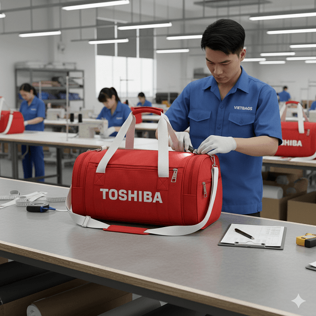 Tự hào là xưởng may balo túi xách hàng đầu tại Việt Nam, Vietbags.net vinh dự là đối tác gia công, xưởng may túi trống thể thao cho nhiều thương hiệu lớn. Chúng tôi thấu hiểu rằng mỗi sản phẩm quà tặng đều đại diện cho uy tín của doanh nghiệp. Dự án túi thể thao Toshiba là minh chứng rõ nét cho năng lực sản xuất của chúng tôi.